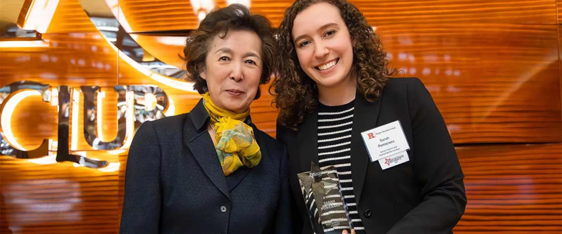 Alumna Sarah Pomeranz poses with RBS Dean Lei Lei as she accepts a Rising Business Star Under 30 Alumni Award in March.